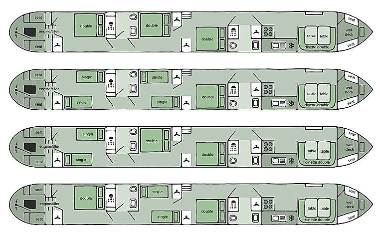 Warbler og Goose er nogle af de største kanalbåde, man kan leje i England, med samme layout, og de passer perfekt til familier og grupper, der ønsker at rejse sammen. Bådene har plads til op til 8 personer og tilbyder tre separate kahytter samt mulighed for yderligere to sovepladser i salonen. Kahytterne kan møbleres med enten enkeltsenge eller en dobbeltseng, alt efter jeres ønsker. Ombord findes to badeværelser, begge udstyret med bruser og toilet for ekstra komfort.