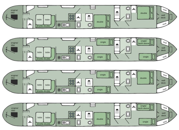 Ombord findes to badeværelser, begge udstyret med bruser og toilet, hvilket giver ekstra komfort under kanalbådsferien. Køkkenet er fuldt udstyret med gaskomfur, ovn, grill, køleskab og god bordplads. Der er også varme ombord til køligere dage. Bådene er komplet udstyret med alt, hvad I behøver for et behageligt ophold – gas, sengelinned og håndklæder er altid inkluderet.